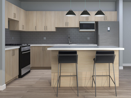يستخدم بناء خزائن المطبخ هذه عادةً مواد فعالة من حيث التكلفة مثل لوح الألياف المتوسطة أو الكثافة المتوسطة (MDF). وهي متوفرة في التشطيبات المختلفة ، بما في ذلك الميلامين أو الصفح ، والتي توفر المتانة وسهولة الصيانة.